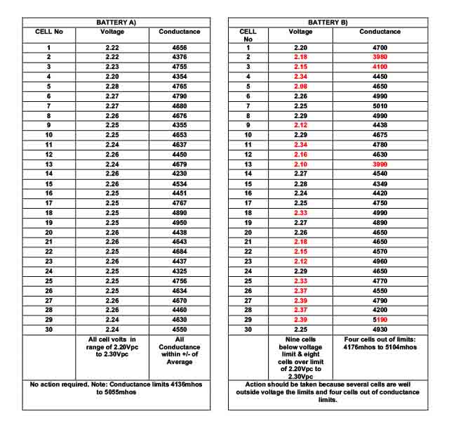 Battery B) readings show that although 9 cells are below the voltage limit, and 3 cells below the conductance limit, no cells are lower than the typical expected specific gravity. This could be for several reasons. One reason may be due to the battery being recently part discharged. This can disrupt the float voltage and ohmic value but because the true state of charge has not changed substantially, the s.g. value has not reduced. The correct procedure is to investigate.